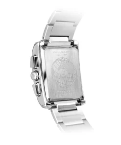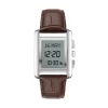 سـاعة كلاسيكية ذات هيكــل فضي مستطيل وحزام من الفولاذ المقاوم للصدأ، مــزودة بـشــاشـة بـلـوريـة ، مــع إضـاءة خلفيـة.
